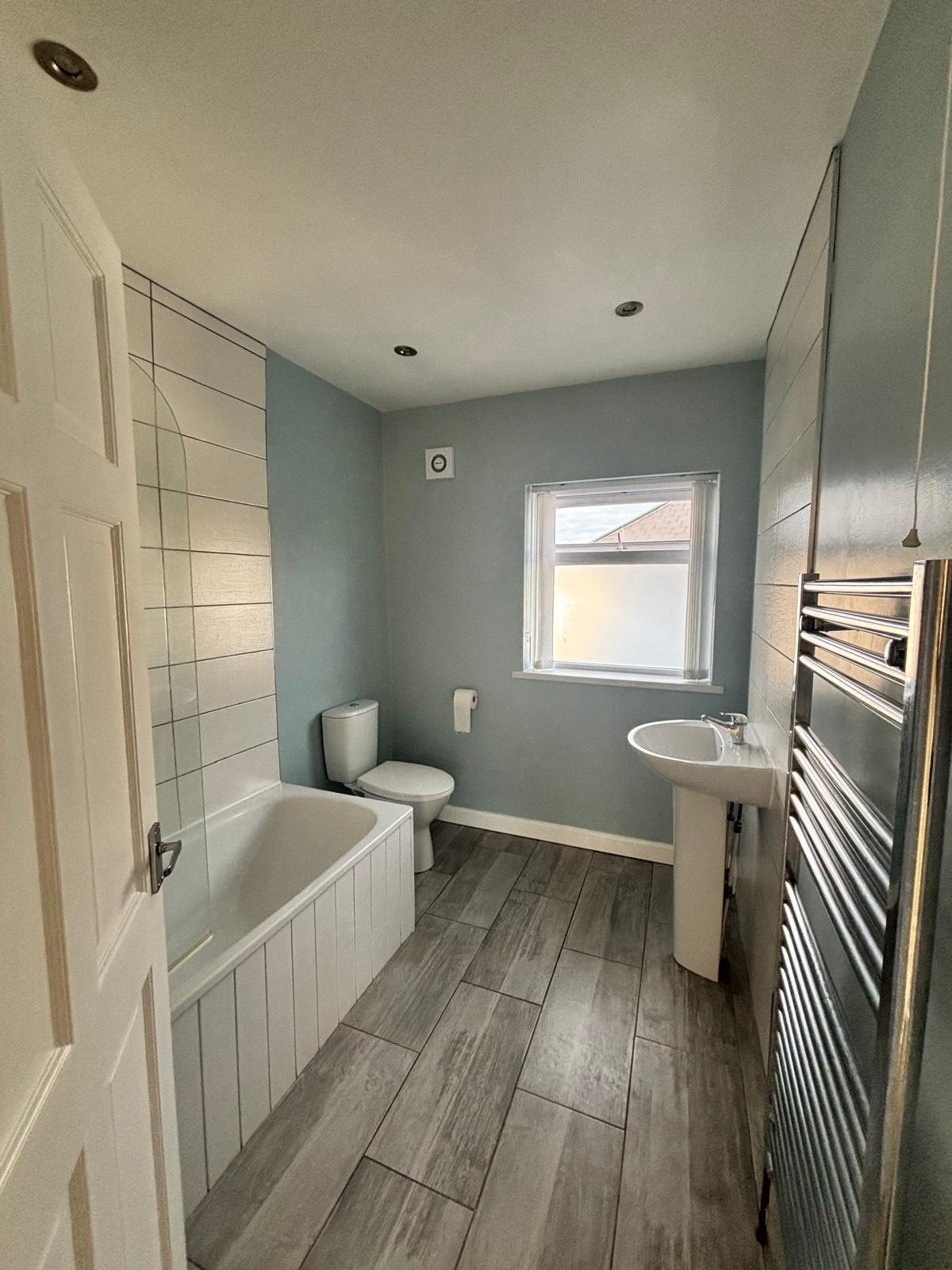 Inside, you’ll find a spacious living room, offering plenty of natural light and a comfortable space to relax or entertain. The modern fitted kitchen is a standout feature, complete with sleek units, ample workspace, and LED lighting for a contemporary feel. The home benefits from gas heating, ensuring warmth and energy efficiency throughout.