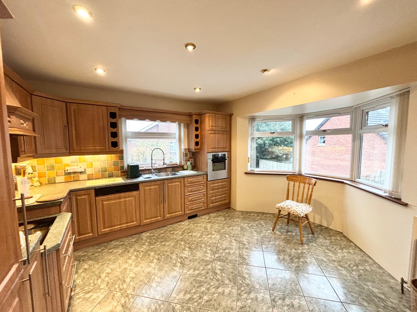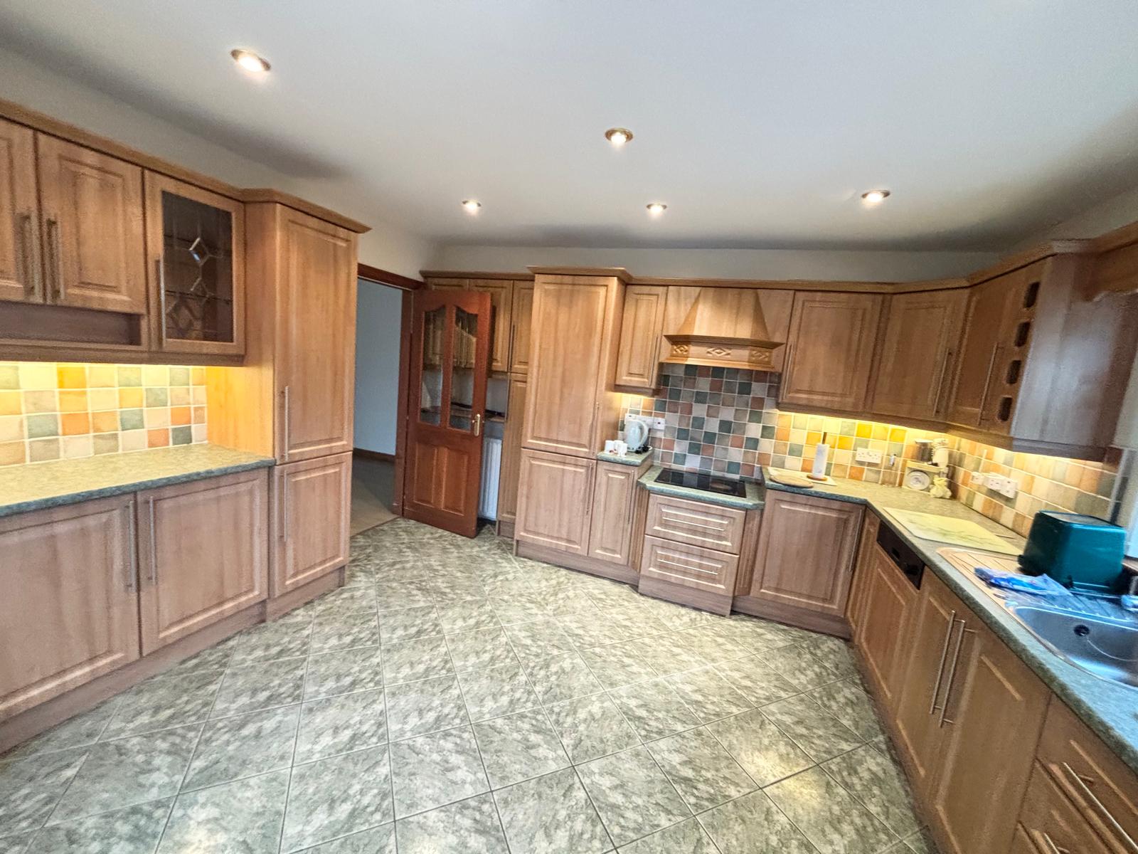 KITCHEN/DINETTE – 14 feet x 13 feet: extensive range of eye and low level units including Zanussi oven, four ring ceramic hob and dish washer. One and a half tub stainless steel sink with mixer taps. Fridge/freezer, tiled floor and splashbacks. Eyeball spotlights, single and double radiators.