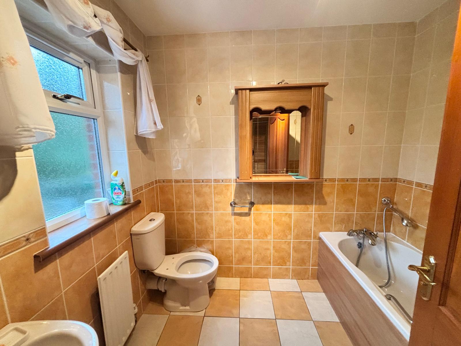BATHROOM – 7 feet 9ins x 6 feet 6ins: fully tiled floor and walls. White suite comprising wash hand basin with mixer taps, lavatory and panelled bath with mixer taps and hand shower. Upright radiator.